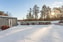 Egen tomt med gräsmatta och stor terrass med pergola samt stenlagd gång.