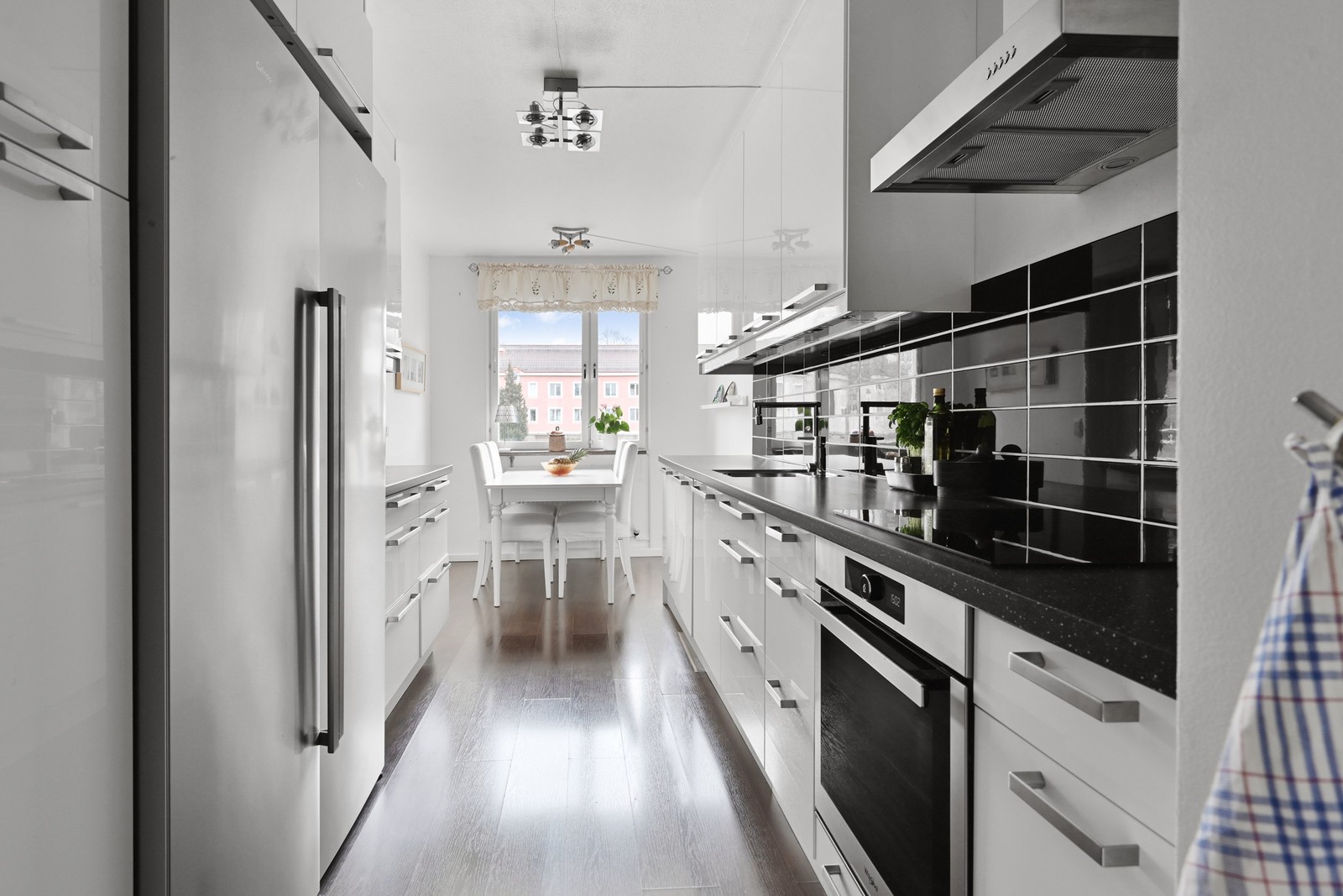 Här stiger ni in i ett hem där varje detalj är omsorgsfullt utvald och där renoveringarna är väl utförda. Det stilrena köket erbjuder vita luckor med ugn, spishäll från 2021, kyl och frys från 2022 samt diskmaskin från 2023 - allt i toppskick för att göra din vardag så bekväm som möjligt.
