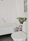 Badrum med kaklade väggar och klinker på golvet. Här finns ett badkar, handfat, badrumsskåp och toalett. Renoverat i samband med stambytet 2015-2016.