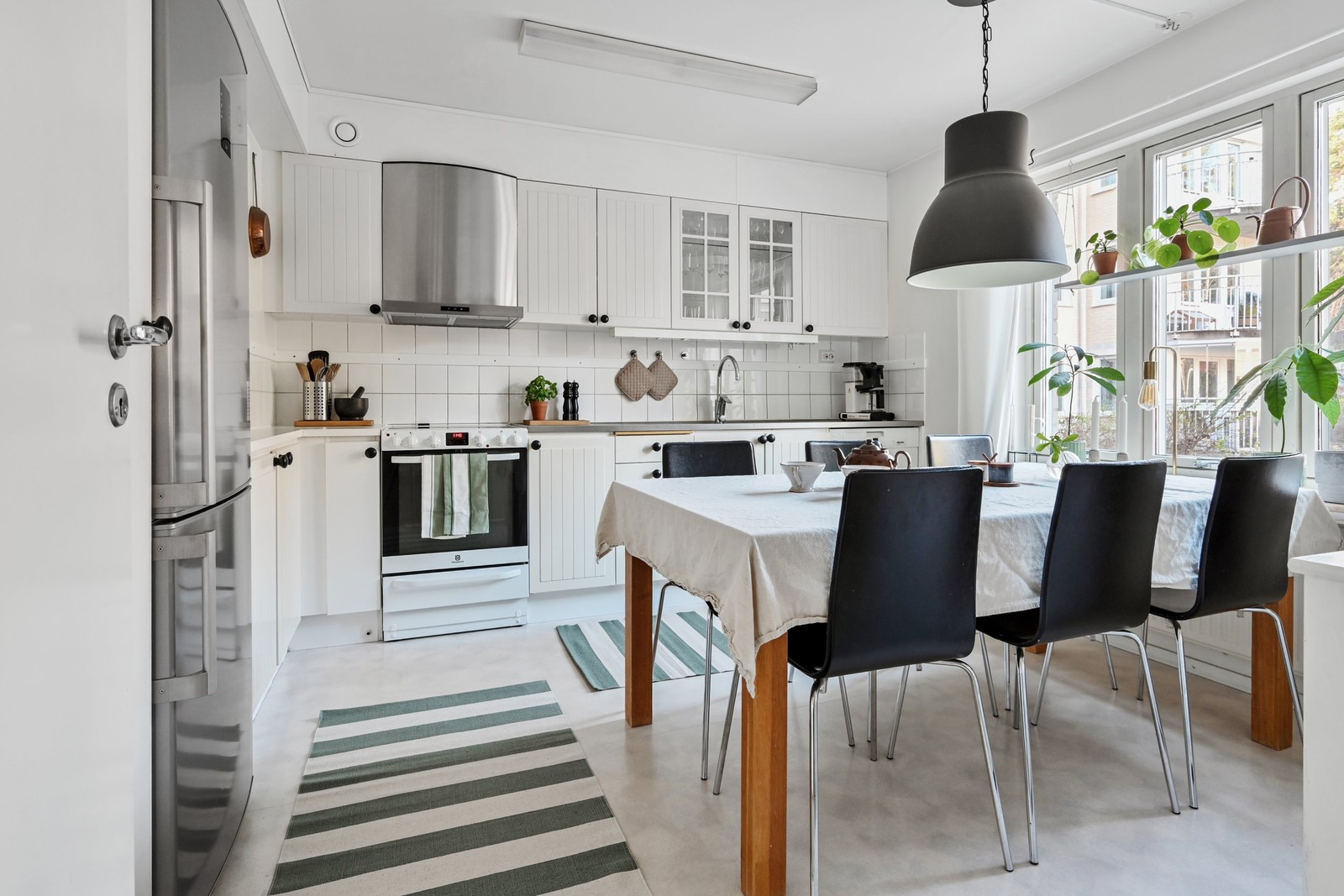 Köket är även det ljust och en trevlig matplats intill fönster.