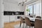 Köket är stilrent med vita luckor och kaklade väggar ovanför arbetsbänken. Köket är utrustat med kombinerad kyl och frys, diskmaskin, häll, ugn, fläkt och inbyggd mikrovågsugn. Här finns även plats för matbord. På golven ligger parkett och väggarna är målade.