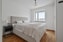Sovrummet är rymligt och rymmer en stor säng. Här finns även garderober. På golvet ligger parkett och väggarna är målade.