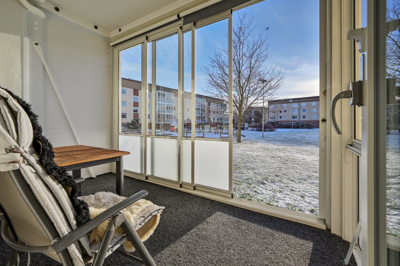 Vardagsrummet är stort och luftigt med bra ljusinsläpp via en hel fönstervägg med utgång till en stor inglasad balkong. Eftersom lägenheten ligger på entréplan kan glaspartierna öppnas upp och man får full access att kunna gå ut på gården.