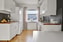 Hemtrevligt kök med vit inredning och gott om skåp och lådor för förvaring av allt ett kök behöver. Här finns spishäll med ugn, fläkt och kyl och frys. Ett städskåp finns också. Arbetsbänkar i trä och hel diskbänk i rostfritt stål.