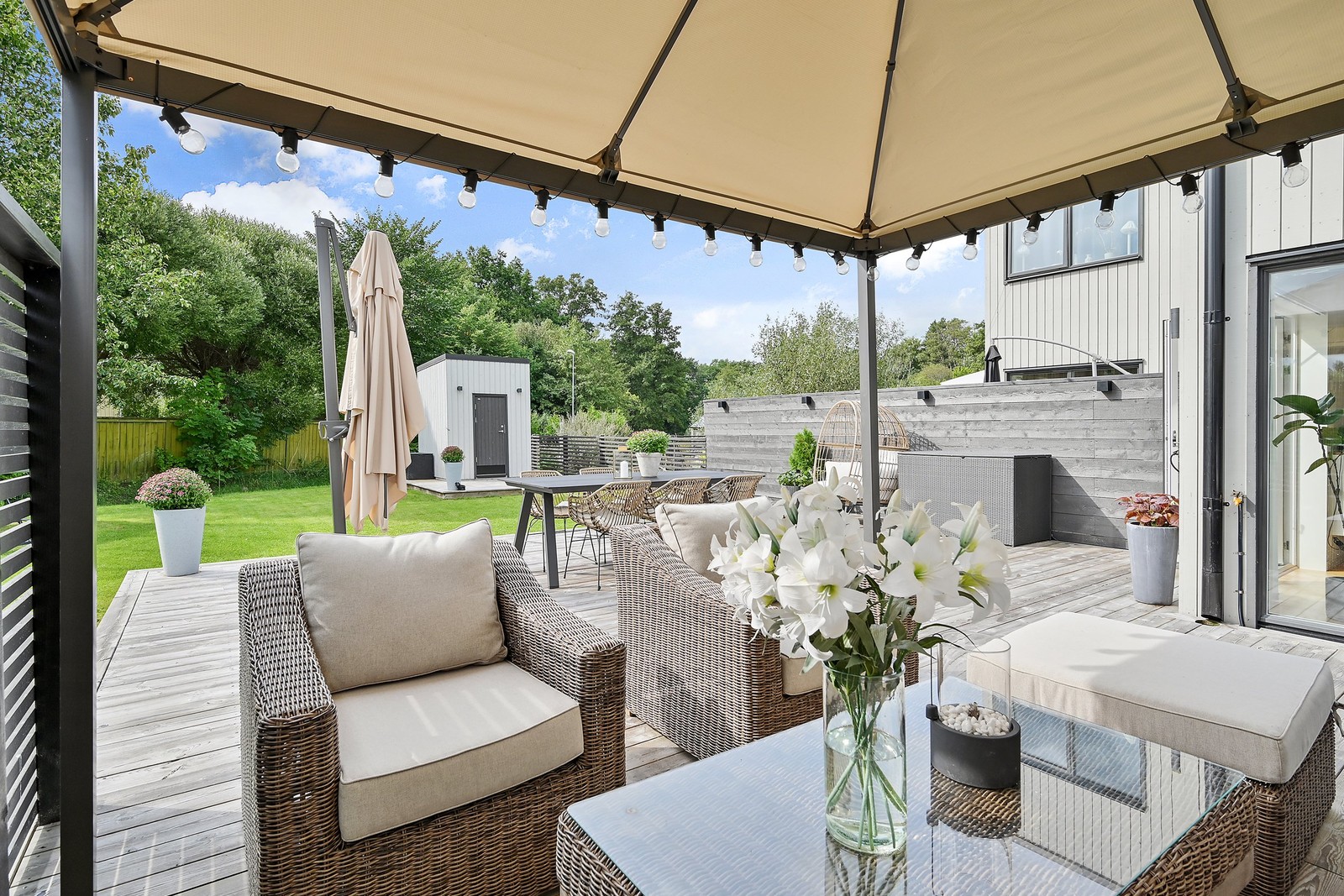 Ute erbjuder huset ännu mer, med två altaner som man byggt till – en på framsidan där morgonsolen skiner och en på baksidan som badar i sol hela dagen och kvällen. Man har ett förråd på framsidan dessutom har ett praktiskt uteförråd byggts extra på baksidan, perfekt för förvaring. På framsidan har man lagt en stengång.