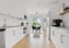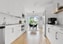 Köket är ljust och välplanerat med vita skåpluckor och stilrent kakel ovanför arbetsbänken, vilket skapar en fräsch och modern känsla. Här finns fullhöjdskyl och frys från Samsung (2019), inbyggd mikrovågsugn från IKEA (2019), spishäll från Siemens (2021), diskmaskin från Siemens (2020) och en varmluftsugn från Cylinda. Kökets öppna layout och stora fönster ger en trivsam matplats där ljuset flödar in. Köket är öppet mot vardagsrummet.