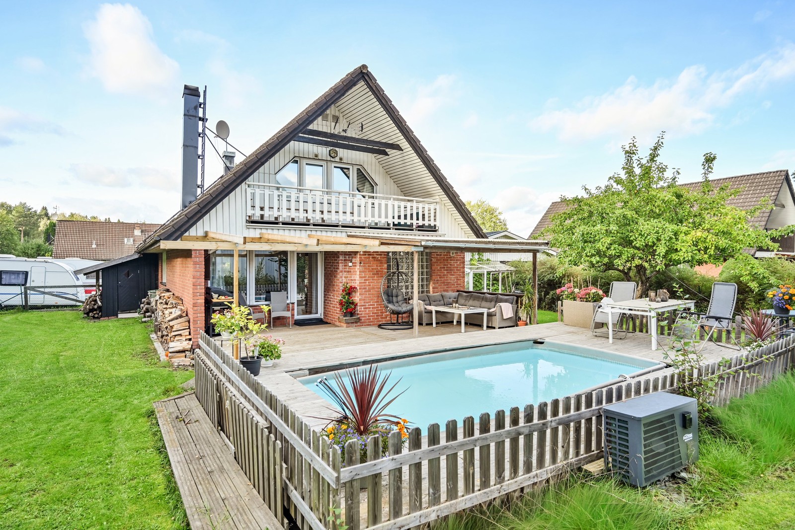 Den insynsskyddade tomten på 894 m² ligger på en lugn återvändsgata och har en pool som förlänger utesäsongen. Här finns även ett separat garage med förrådsdel. Läget är eftertraktat med närhet till natur, lekplatser, förskola och skola – samt smidiga kommunikationer och service.