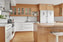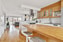 Bänkskivorna i vit marmor och massiv ek, mitt i köket finns en stor köksö som erbjuder extra arbetsyta, förvaring och möjlighet till matplats. Köket är fullt utrustat med kyl, frys, ugn, fläkt, diskmaskin och mikrovågsugn, vilket gör det både praktiskt och inbjudande för matlagning och umgänge.
