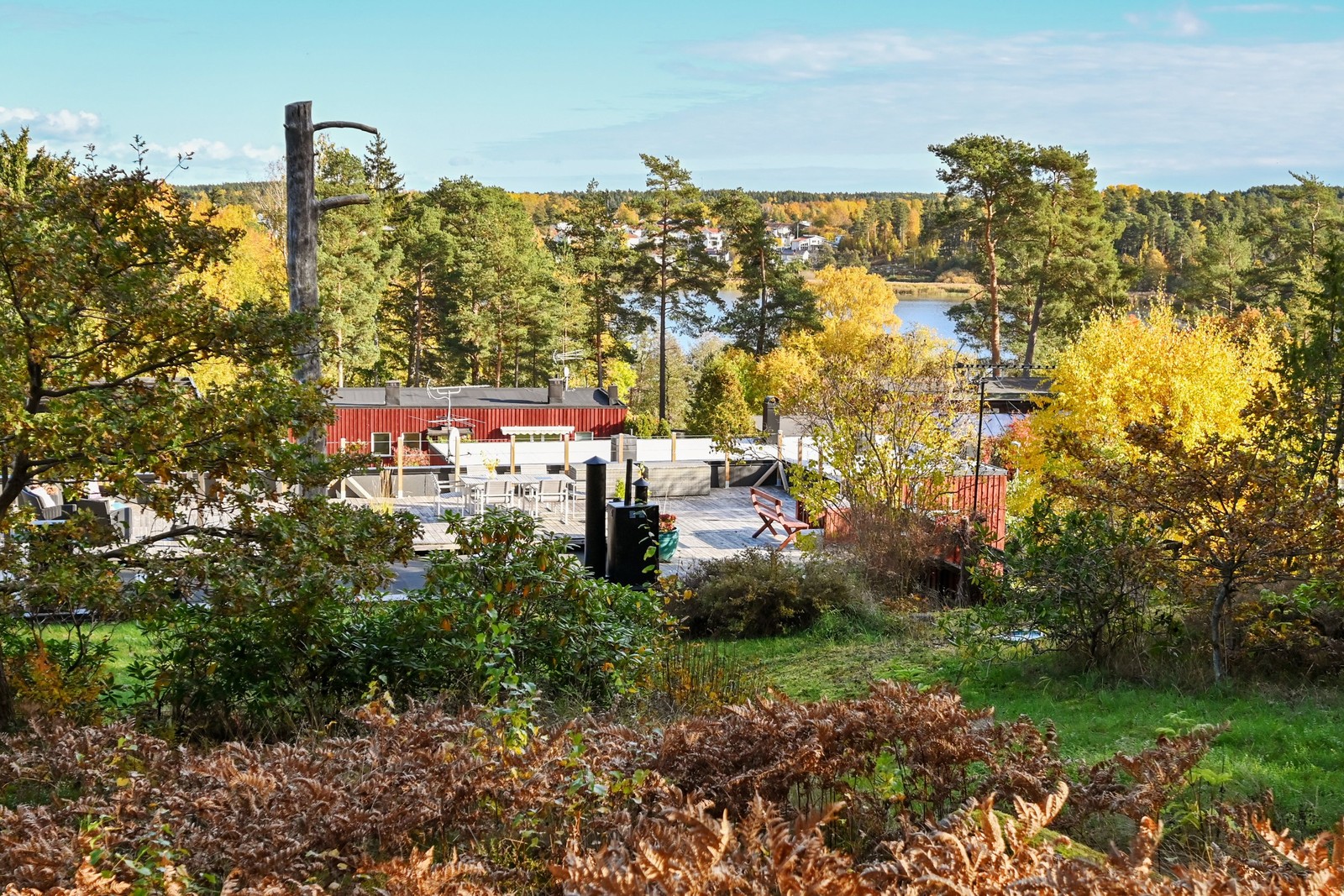 Området är fridfullt och präglas av närheten till vattnet – sommartid tar man cykeln med flytvästen på eller promenerar i badrock ner till bryggorna, och vintertid plogas isen i viken för långfärdsskridskoåkning. Här bor man i en formren villa som med sitt tidlösa uttryck smälter in naturligt i den gröna sluttningen. Bostaden omfattar 221 kvm boyta och ytterligare 31 kvm biarea, fördelat över en genomtänkt och ljus planlösning där sällskapsytorna öppnar sig mot utsikten genom stora glaspartier. Formspråket är klassiskt modernt – arkitekturen från 1972 känns lika relevant idag, med rena linjer, rymliga rum och en harmonisk helhet.