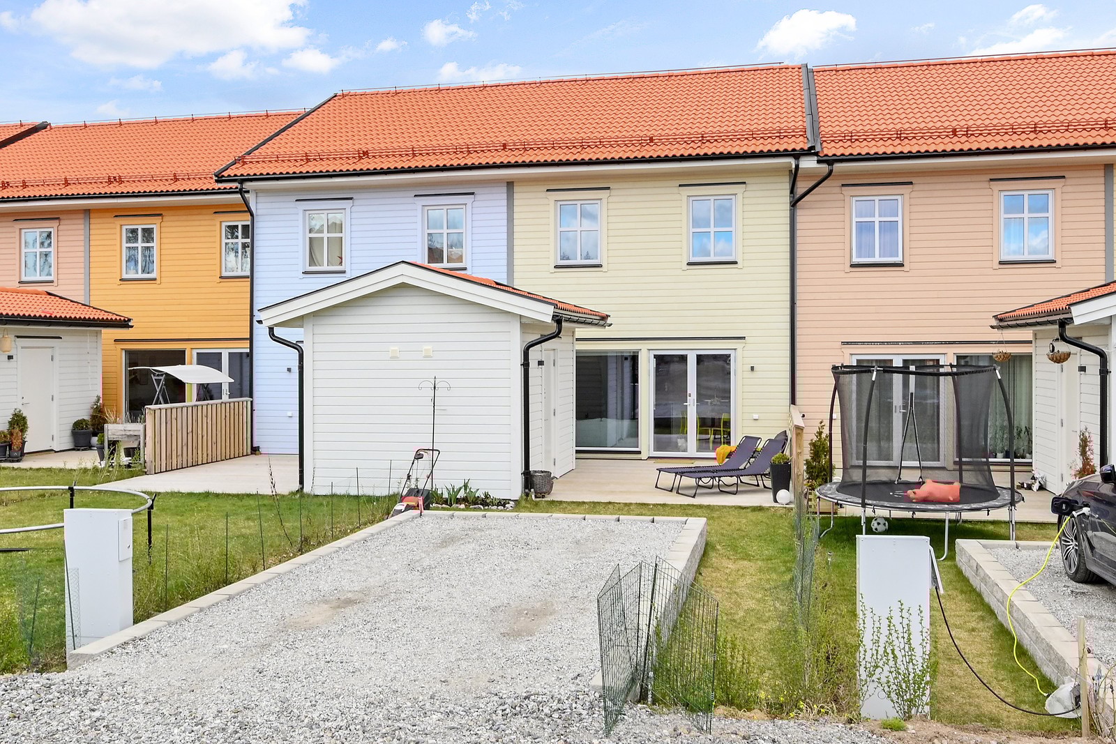 Varmförrådet på baksidan av radhuset är stort och ger bra förvaring av utemöbler och trädgårdsredskap.