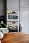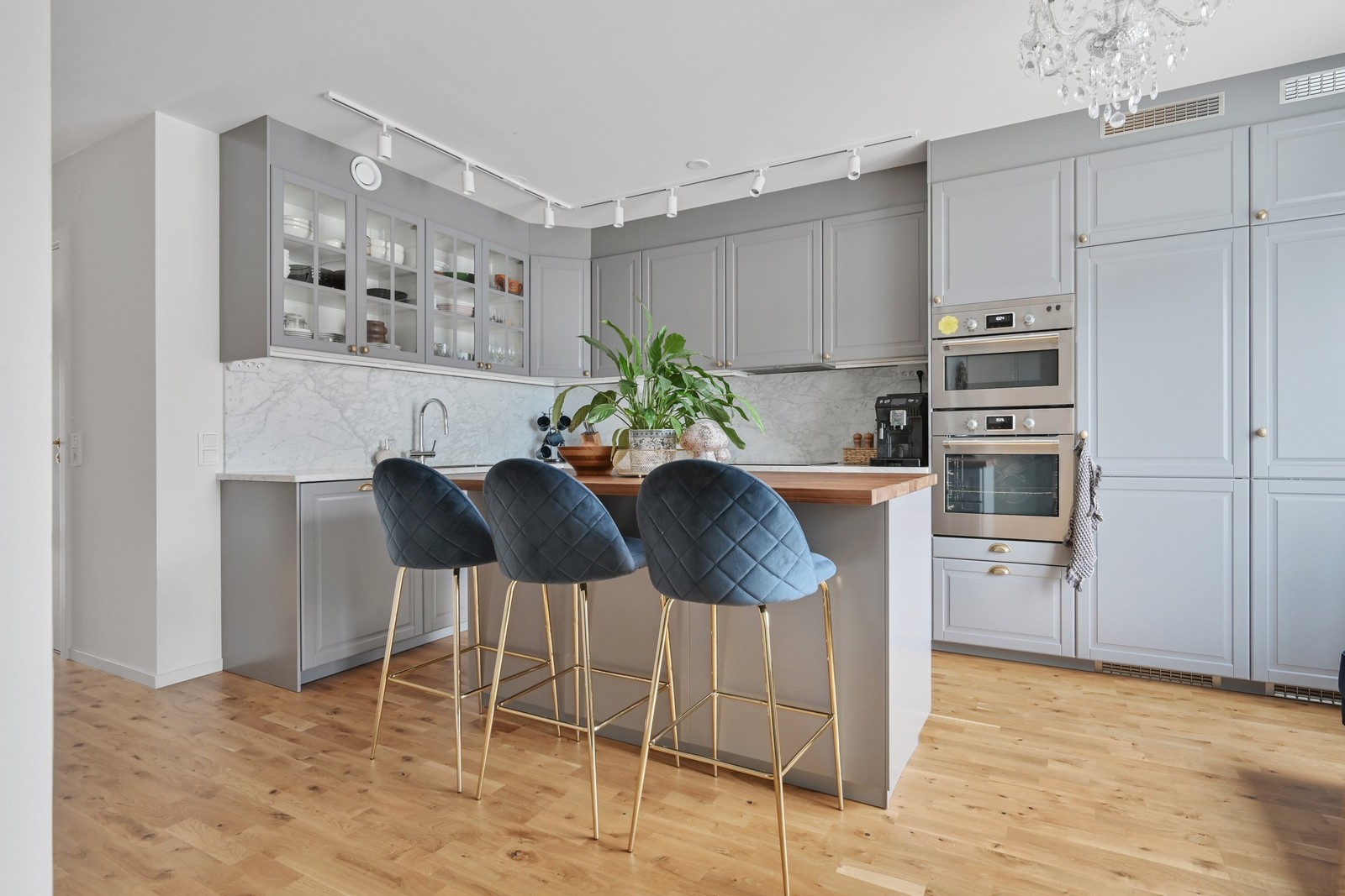 Smakfullt kök i lantlig stil med grå köksluckor, marmormönstrad bänkskiva och matchande stänkskydd som ger ett stilrent och tidlöst uttryck. Köket kompletteras av en praktisk och social köksö som skapar extra arbetsyta, förvaring och en naturlig samlingspunkt perfekt för både matlagning och umgänge. Den maskinella utrustningen består av induktionshäll, inbyggd varmluftsugn, kombiugn/mikrovågsugn, integrerad diskmaskin samt fullstor kyl och frys. Köket är även utrustat med inbyggd fläkt och rostfri dubbelho.