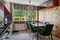 Väggen intill matplatsen har en ljuvlig blommig tapet som ger rummet karaktär och följs upp av den rödtonade glasväggen intill kyl och frys och tillsammans med det enhetliga svartskimrande golvet ger det bostaden en lyxig känsla. Här finns också ett stort unikt skafferi med vita skjutdörrar och en extra frys. Ljus matplats intill fönster.