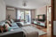 Hallen mynnar ut i en öppen planlösning där kök och vardagsrum möts. Kökets yta är generöst och naturligt ljusinsläpp genom två fönster. Vita skåp och fronter och liggande grå stenliknande skivor ovan bänkar med svart laminat. Småskalig svart tonad mosaik ramar in köksbänken. Rostfria vitvaror.