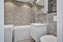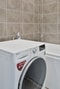 Badrummet är fräscht med kaklade väggar och klinker på golvet. Rummet är utrustat med badkar, wc, spegel, handfat samt förberett för tvättmaskin.