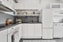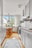 Bänkytor i grå laminat och matchande mosaik som stänkskydd. Vita väggskåp för förvaring samt vita hyllor perfekta för specerivaror. Även ett skåp med glasdörrar för fina glas eller sådant som gärna får synas. Kyl,( nytt okt 2025), frys , induktionshäll, ugn och diskmaskin. En mindre matbord ryms här för frukost en eller fika eller för jobb hemifrån. Ett större matbord ryms i vardagsrummet.