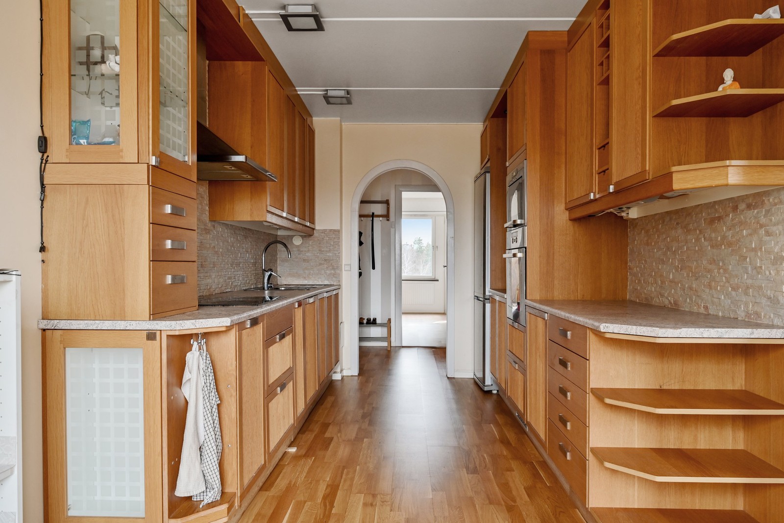 Mysigt kök med kaklade väggar ovanför arbetsbänken. Köket är utrustat med kombinerad kyl och frys, inbyggd mikrovågsugn och ugn, häll och fläkt. Det finns en diskmaskin som inte fungerar, så det är förberett om man vill installera en ny diskmaskin. Intill arbetsytan finns en matplats.