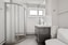 Duschrum med kaklade väggar runt duschhörnan och resten av väggarna är målade. På golvet ligger plastmatta. Rummet är utrustat med dusch, handfat, spegel och toalettstol. Ett fönster som ger extra ljus.
