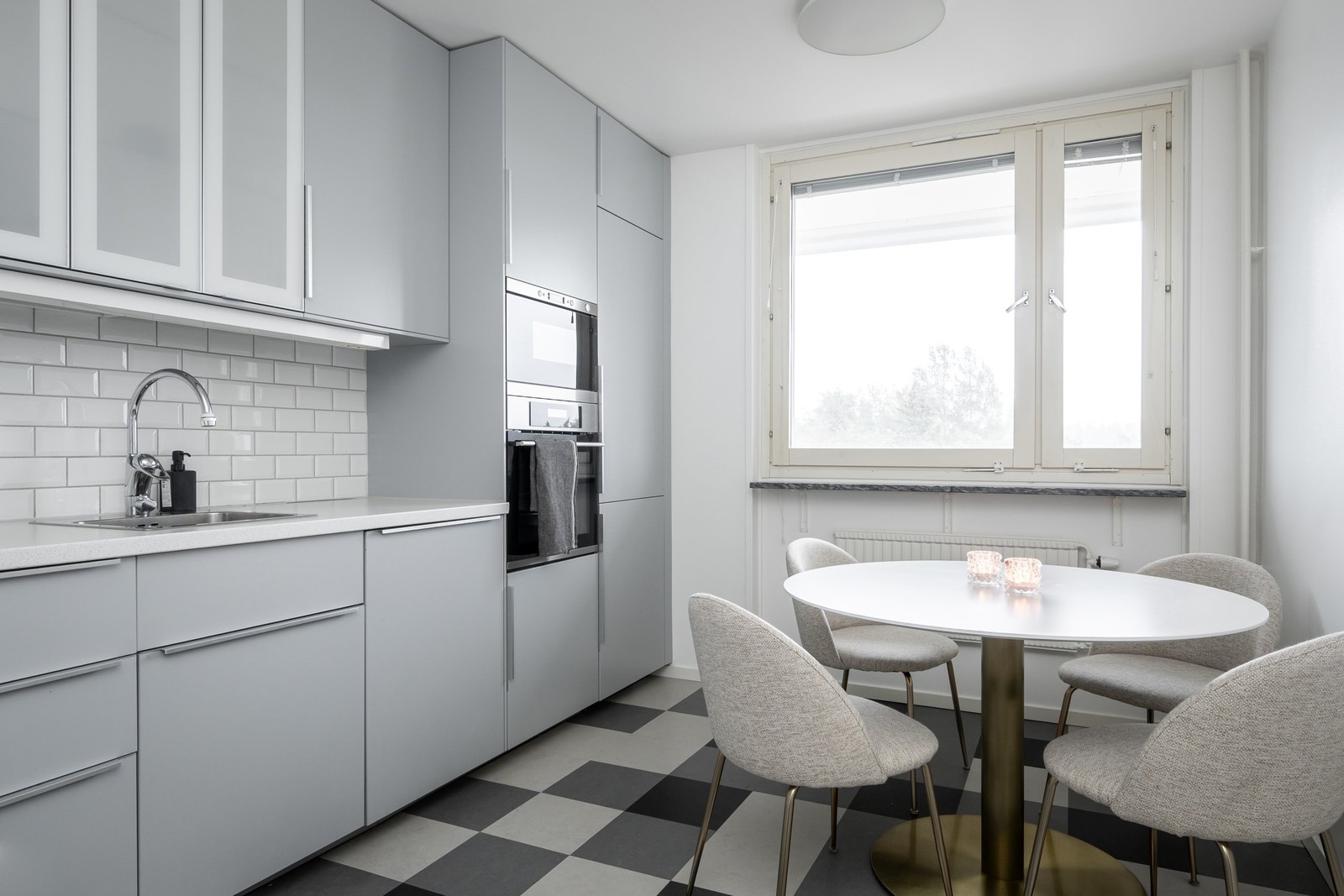 Köket imponerar med sin stilrena design och moderna vitvaror. Här finns gott om arbetsyta och förvaring, vilket gör matlagningen både enkel och inspirerande.