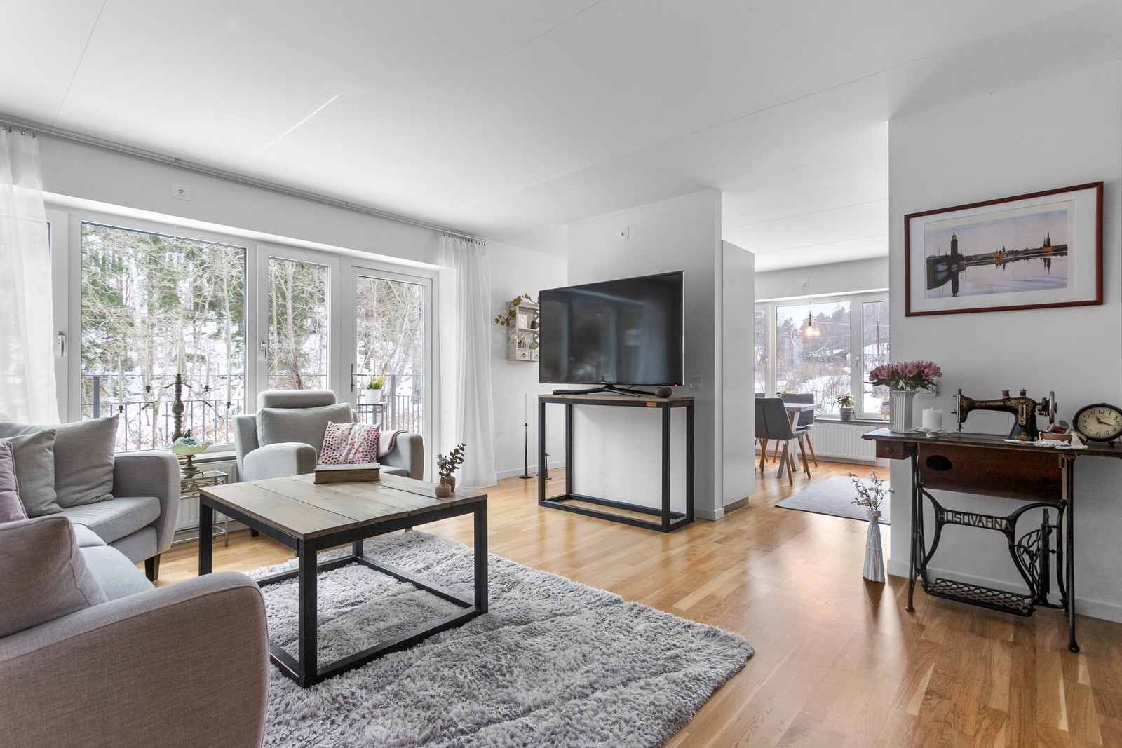Bostaden disponeras med tre bra sovrum, rejält vardagsrum, kök, badrum, gäst-wc och balkong. Balkongen är i generös storlek och ligger mot föreningens gård med grönska och natur som närmsta granne. I anslutning till balkongen hittar vi det rymliga vardagsrummet med gott om plats för soffgrupp och umgänge. Fint kök i bra skick med allt du kan önska. Här finns också plats för matbord.