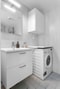 Rymligt badrum med ljust klinker och vita kaklade väggar. Duschhörna med en glasvägg, wc, handdukstork, tvättmaskin, skåp över tvättmaskin och handfat med kommod.