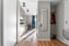 Entréhall med beigea väggar samt parkettgolv. Plats för hatthylla finns till höger. En stor garderob.