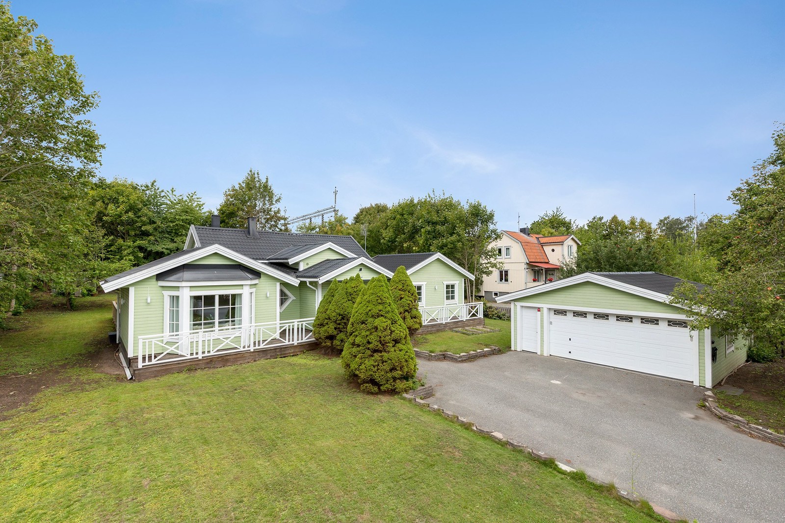 Den asfalterade uppfarten kan härbärgera såväl flertalet bilar som annat man vill ställa upp. Dubbelgaraget är rymligt och har även en förrådsdel. I garaget står husets värmekälla - bergvärmepumpen som är ny från 2025.