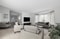Stilrent och representativt vardagsrum med stora fönsterpartier som vetter mot såväl entré- som baksida varav de senare är försedda med stora skjutdörrspartier som vetter ut mot trädäcket. På golvet övergår klinkergolvet från hallen till ett ljust trämönstrat vinylgolv som harmoniserar med den strama och ljusa miljön som vardagsrummet erbjuder. Spotlights i tak.