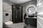 Exklusivt badrum med sobert grå kakel- och klinkerkombination. Spotlights i tak, vägghängd toalett, tvättställskommod i sobra färger, spegel med integrerad belysning och duschhörna med glaspartier m m.