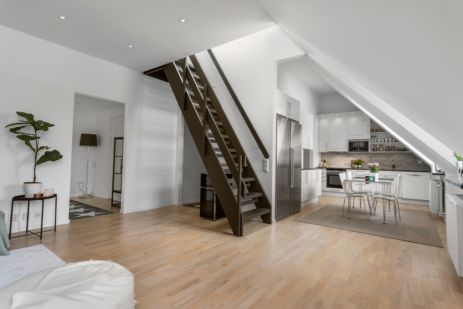 Varmt välkommen till denna fantastiska vindsvåning i två plan om hela 103 kvm! Här har inget lämnats åt slumpen. Rymlig hall med gott om avhängningsmöjligheter. Bostaden har stora och öppna sociala ytor mellan kök och vardagsrum och har genomgående moderna och exklusiva materialval. Köket är fint renoverat med väldigt goda arbetsytor. Här erbjuds tre stora sovrum varav två på nedre plan och ett på övre plan. Master bedroom har både balkong mot innergården med vidsträckt utsikt över Silverdal samt en rymlig walk in closet. Det övre loftet har byggts ut till en hel våning och är idag hela 20 kvm. Badrummet är helkaklat med klinker, golvvärme och handdukstork. Lägenheten präglas av mycket ljus tack vare fönster i två väderstreck samt fint vitmålade väggar. Total golvyta på 119 kvm enligt areamätning. Till bostaden hör även ett källarförråd.