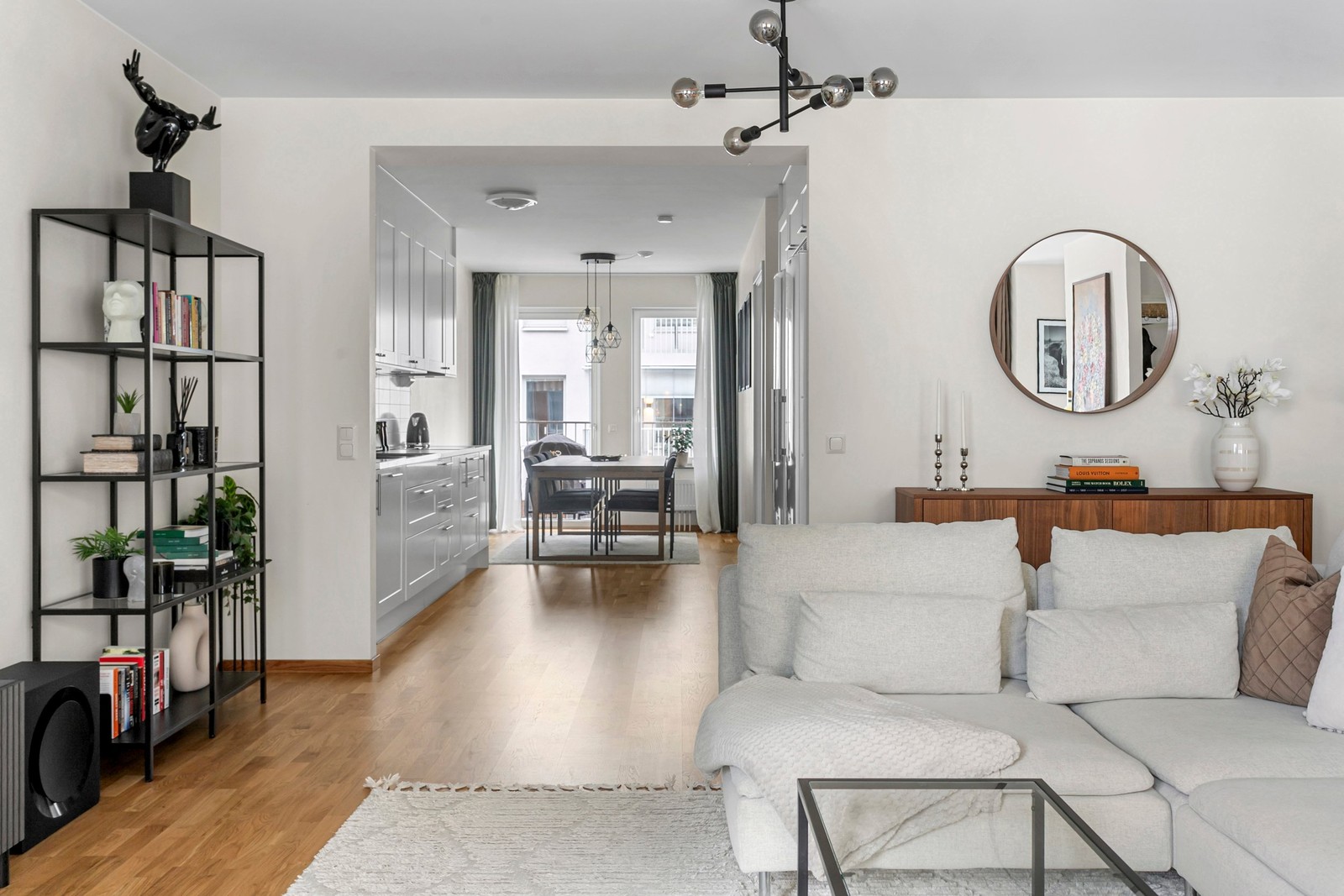 Ljus och rymlig trea med moderna material och stilrena färgval. Öppen planlösning mellan kök/vardagsrum ger härliga, sociala ytor och en känsla av rymd. Välutrustat kök i vitt utförande med hel kyl och frys, diskmaskin samt integrerad ugn och micro. För den som önskar avgränsa köket från vardagsrummet är det enkelt att sätta upp en vägg. Härlig balkong som nås från matplatsen. Genomgående parkettgolv och vitmålade väggar. Goda förvaringsmöjligheter med flera garderober, klädkammare och separat källarförråd. Ordentligt badrum med golvvärme, tvättmaskin, torktumlare och dusch. Föreningen tillhandahåller garage samt övernattningslägenhet att hyra.