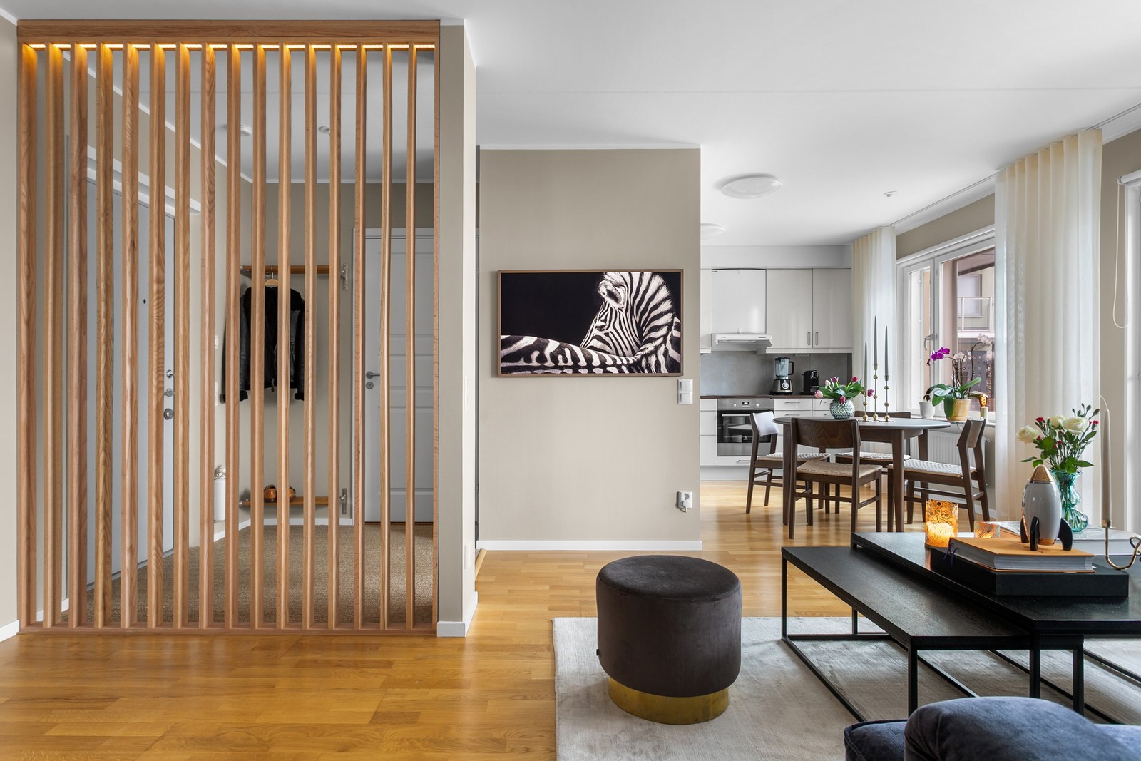 Äntligen en lägenhet med riktig wow-känsla! Här bor du i en mycket stilfullt inredd lägenhet med underbar uteplats i ett soligt syd-sydvästläge. Lägenheten passar perfekt för dig, eller er, som vill ha ett lättskött boende med snygga detaljer och i gott skick. Du välkomnas av en vacker spaljé i ek med inbyggd belysning och en platsbyggd sisalmatta. Vidare möter du en öppen planlösning mellan kök, matplats och vardagsrum som ger ett underbart ljusinsläpp och gör det enkelt att möblera efter eget tycke. Interiören är väl genomtänkt och ligger rätt i tiden med sobra, naturnära färger och material. Stort badrum med både tvättmaskin och torktumlare, arbetsytor och förvaring. Dessutom är det utrustat med behaglig golvvärme. Sovrum med måttanpassad garderob, också den med inbyggd belysning och lyxig heltäckningsmatta framför, och väggfast spegel. Har du svårt att hålla ordning i garderoben är det enkelt att sätta dit dörrar, eller sätta upp en vägg och göra en klädkammare av utrymmet. Sommartid blir den stora uteplatsen en given plats att vara på från morgon till kväll. Här ryms både gasolgrill, loungegrupp och middagsbord - kanske också en odlingslåda. Varför inte skaffa en infravärmare och förlänga säsongen? Möjligheterna är många!