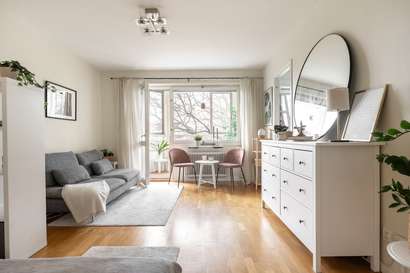 Bostaden präglas av en modern och stilren känsla. Du välkomnas av en rymlig hall med både hatthylla och garderober. Intill ligger det helkaklade badrummet med badkar. Vidare in finns ett stort allrum med plats för soffa, säng, tv och mindre matplats. Härifrån nås den stora inglasade balkongen som når många soltimmar runt lummiga träd. Köket är fullt maskinellt utrustat och har bra arbetsyta.