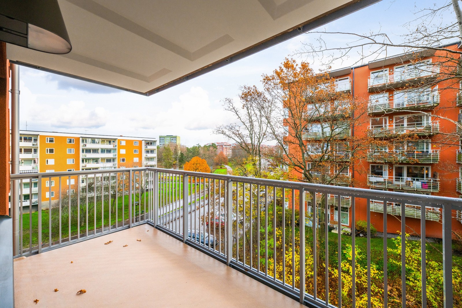 Den rymliga balkongen bjuder plats för både avkoppling och umgänge. Interiören präglas av vitmålade väggar, vacker ekparkett och fönsterbänkar i natursten – detaljer som tillsammans skapar en tidlös och elegant helhet.
