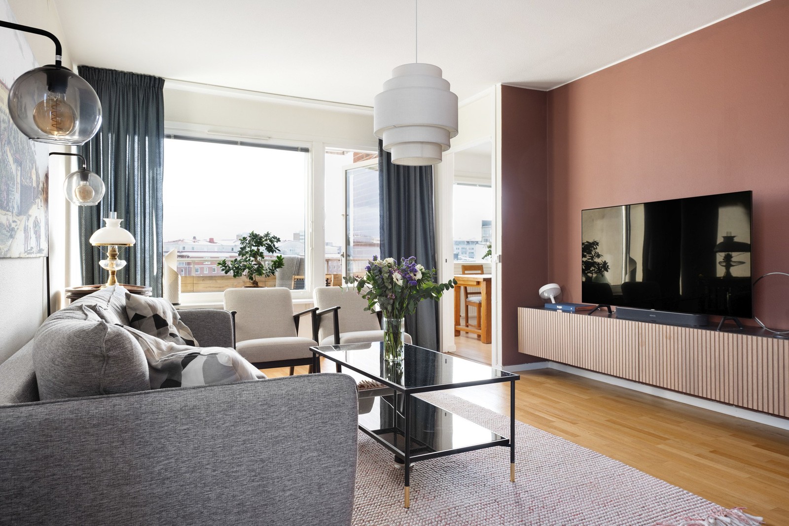 Bostaden håller en hög standard och har allt den medvetna köparen kan önska sig. Redan när man kommer in i hallen känner man av den ljusa och härliga känslan som bostaden präglas av. Lägenheten bjuder på ett luftigt och lättmöblerat vardagsrum som ger en mycket trevlig atmosfär och rymd som förstärks av härligt ljusinsläpp. Här har ni gott om plats för stor soffgrupp framför mediabänken samt ett middagsbord för trevliga bjudningar om så önskas. Från vardagsrummet når ni bostadens rymliga balkong i soligt söderläge.