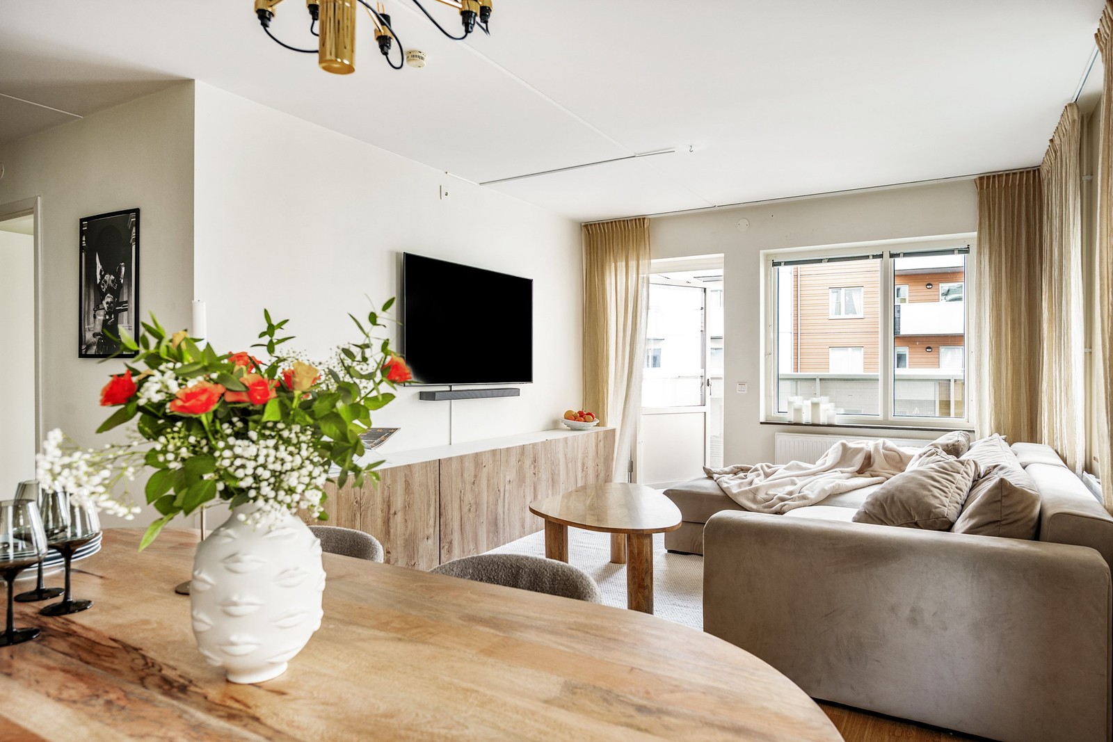 Planlösningen är öppen och skapar en trivsam känsla där kök och vardagsrum knyts ihop på ett naturligt sätt. Köket är modernt med bra förvaring och plats för matbord, och från vardagsrummet når du den rymliga balkongen.