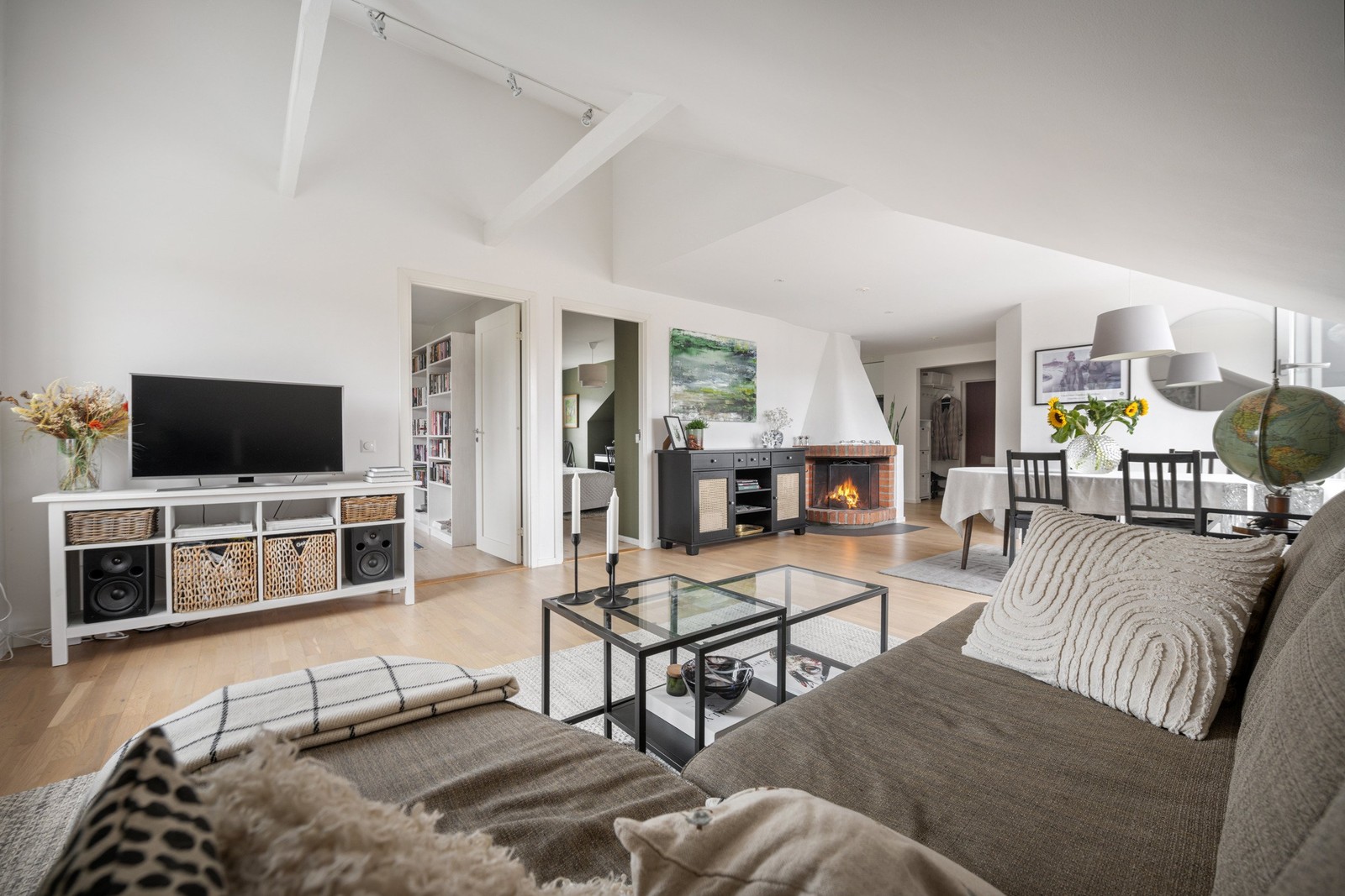 Fönster i tre väderstreck låter ljuset flöda fritt genom sällskapsdelen som är placerad i hjärtat av lägenheten, här finns även den eldningsbara öppna spisen. Från vardagsrummet når ni via glasdörrar den väl tilltagna terrassen i sydväst som är utrustad med infravärme samt markis. Gränsen mellan inne och ute suddas ut, och under de varmare årstiderna blir terrassen som ett extra rum där ni bor ostört och insynsskyddat.