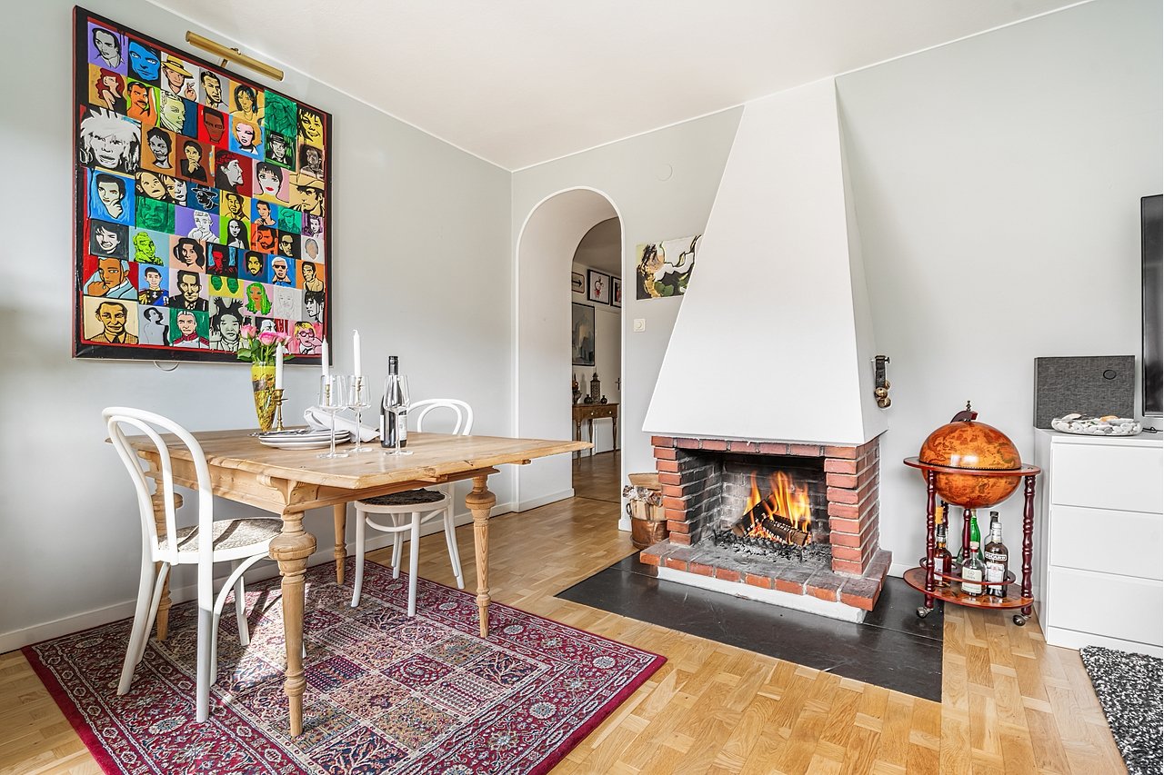 Omsorgsfullt renoverad lägenhet där originaldetaljer har bevarats och kompletterats med uppdateringar i tidstypisk stil. Färgskalan är harmonisk och varje rum har sin egen karaktär. Köket har bevarad originalinredning i grön kulör, kompletterad med platsbyggda lösningar och moderna påkostade vitvaror från 2022, även en vinkyl. Det rymliga vardagsrummet erbjuder både burspråk, fungerande öppen spis och utgång till en balkong i soligt söderläge. Här kan ni öppna upp väggen mellan kök och vardagsrum för att få en social och öppen känsla! Badrummet renoverades 2021 med bytt duschvägg 2026 med ursprunglig stil i fokus. Här finns måttbeställd duschvägg i glas, golvvärme och spotlights. Väggarna är helkaklade i vitt och grönt med svart list, och golvet är svart- och vitrutigt klinker. Rummet har vägghängd wc, handfat med kommod, badrumsskåp med belysning, handduksvärmare samt blandare från Sekelskifte, och kakel och klinker från Byggfabriken. Sovrummet ligger lugnt med morgonsol och god förvaring i klädkammare .Innanför säkerhetsdörren ligger hallen med William Morris klassiska pilbladsmönster på väggarna och ett golv i kolmårdsmarmor med behaglig golvvärme. Entréhallen leder vidare till en rymlig inre hall med praktisk förvaring i klädkammare. Härifrån nås samtliga rum i lägenheten. Lägenheten har även bra förvaringsmöjligheter med både vindsförråd och matkällare.