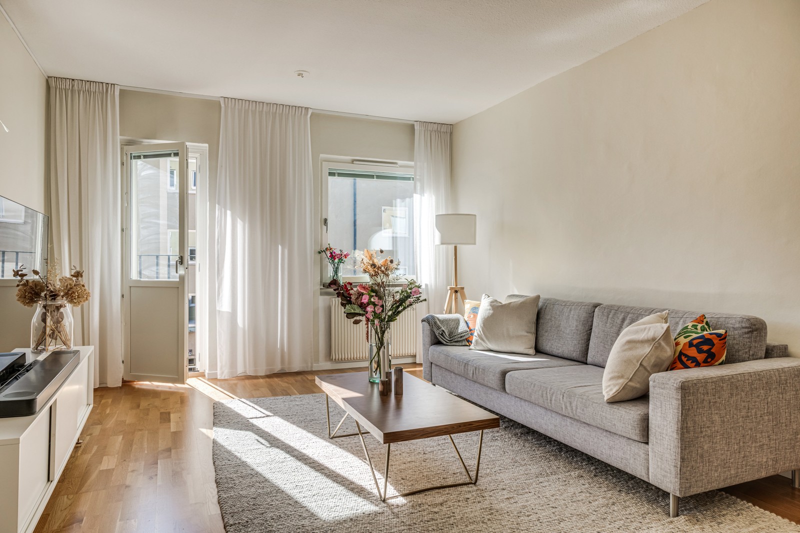 Varmt välkommen till denna ljusa och välplanerade 3:a som är renoverad. De stora fönsterna släpper in rikligt med dagsljus och skapar en luftig känsla genom hela bostaden. Köket är stilrent och praktiskt med plats för matbord eller sociala middagar, vardagsrummet erbjuder lättmöblerade ytor för umgänge och kontorsplats. Det helkaklade badrummet är utrustat med golvvärme och tvättmaskin. Trivsam balkong som erbjuder sol i sydostläge.