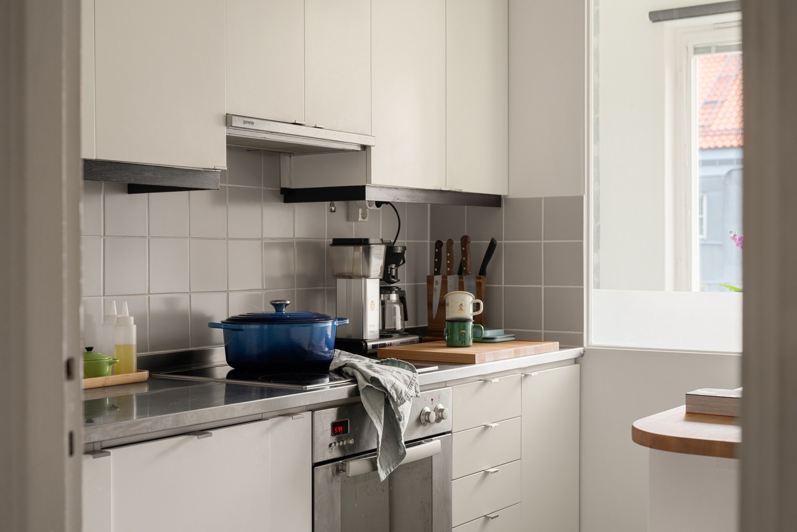Stilrent och vackert kök med all maskinell funktion ni kan önska. Köket präglas av fint rutigt golv och en gedigen arbetsbänk. Här finns gott om förvaring och bra arbetsytor. Tack vare fönstret mot sovalkoven strömmar även ett härligt ljus in i köket, som skapar en luftig och trivsam atmosfär. Köket är utrustat med spishäll, ugn, fläkt och kyl/frys och integrerad diskmaskin.