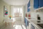 Stilrent kök med gott om arbets- och förvaringsutrymmen bakom den härliga blå inredningen. Den maskinella utrustningen består av en spis, ugn, fläkt, diskmaskin samt kyl/frys. Ett fönster vetter ut mot den lugna gatan.
