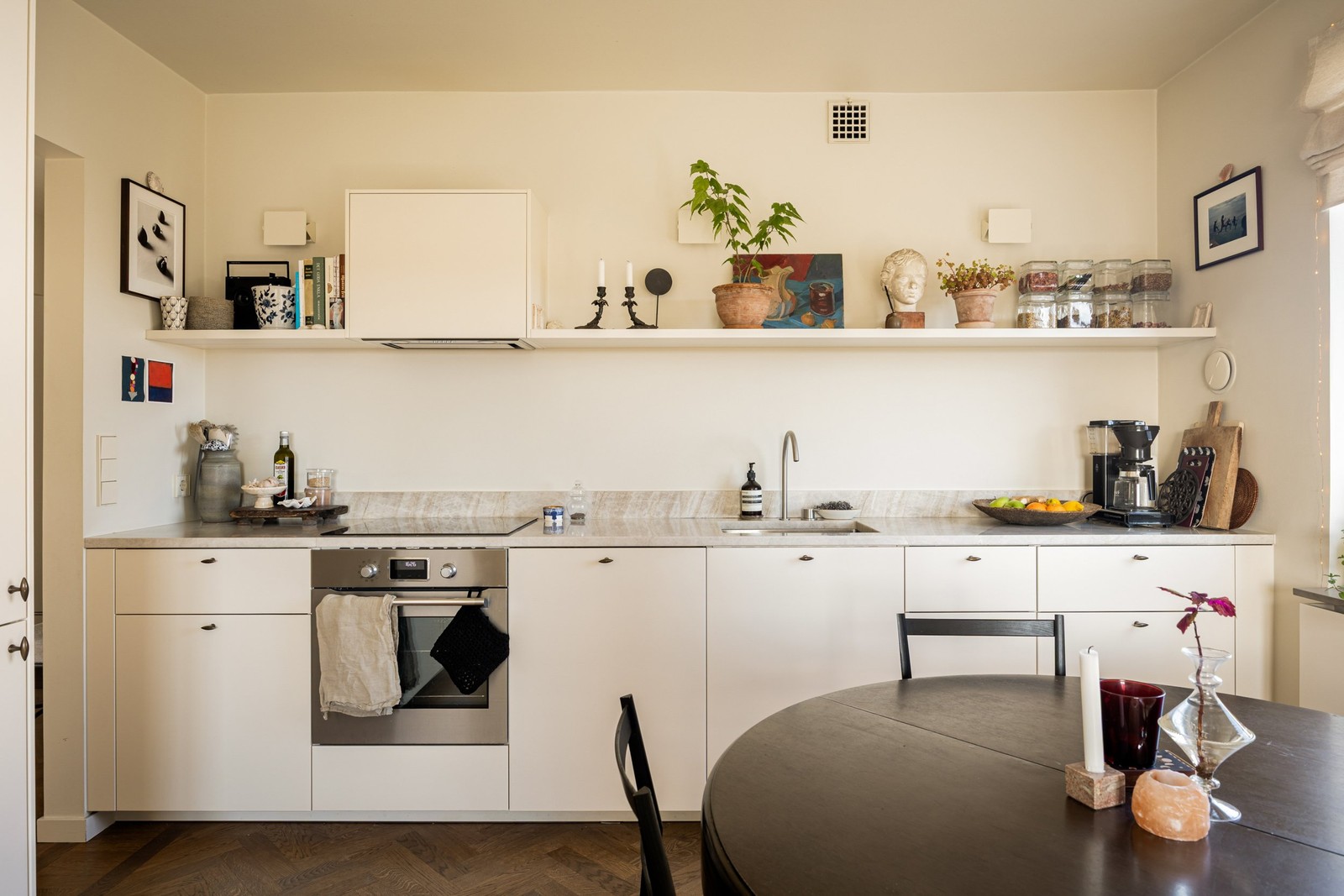 Bostaden har renoverats med stor omsorg och erbjuder platsbyggda lösningar som både maximerar funktion och skapar ett enhetligt, arkitektoniskt uttryck. Väggar och snickerier är målade i samma kulör, vilket ger ett lugnt och harmoniskt intryck.