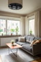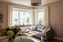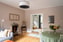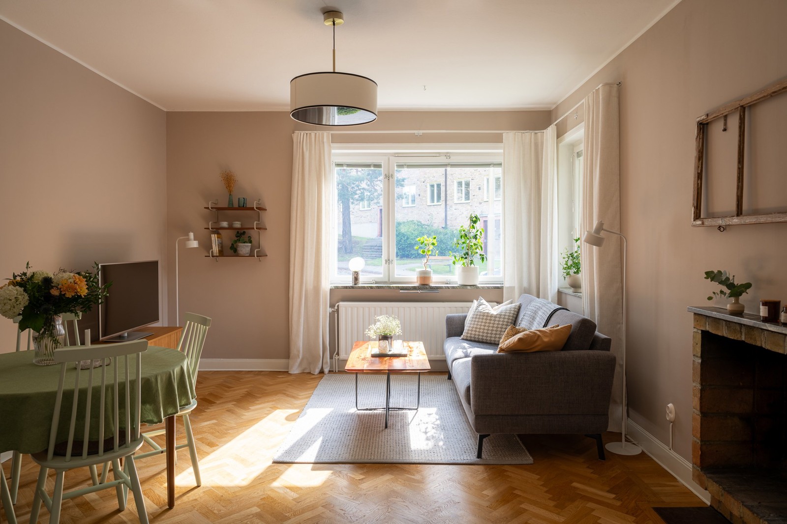 Ljust och inbjudande vardagsrum med generös takhöjd om ca 2,7 meter. Här finns en charmig, infälld och fungerande öppen spis som utgör rummets naturliga samlingspunkt samt ett vackert bevarat stavparkettgolv i klassiskt fiskbensmönster. De djupa fönsternischerna med fönsterbänkar i massiv sten och de stora fönsterpartierna bidrar till ett härligt ljusinsläpp. Hela bostaden har uppdaterade eluttag ur serien "Renova" och samtliga taklampor är utrustade med dimmers för flexibel belysning.