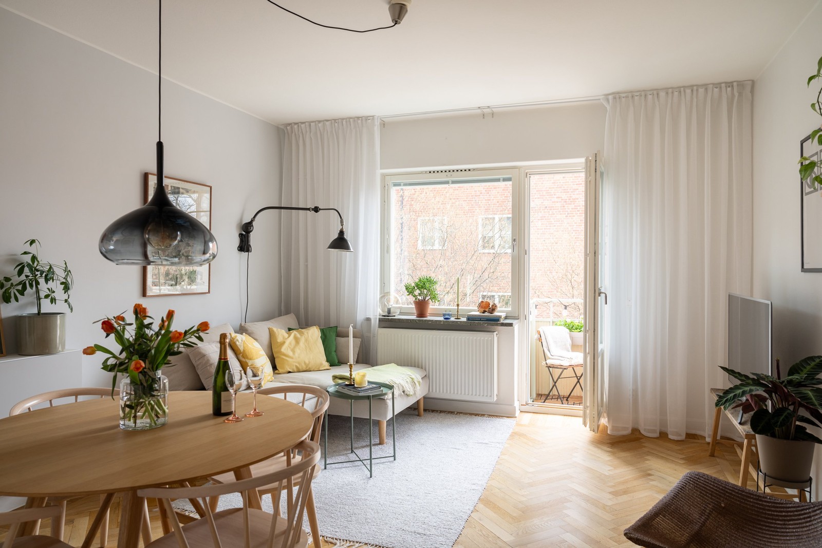 Vardagsrummet bjuder på rikligt ljusinsläpp från stora fönster i söderläge och balkongdörr som leder ut till en ombonad balkong med utsikt över grönskande omgivningar – en naturlig förlängning av hemmet under sommarhalvåret. När grönskan står i full blom blir insynen dessutom nästintill obefintlig, vilket skapar en privat och rofylld uteplats.