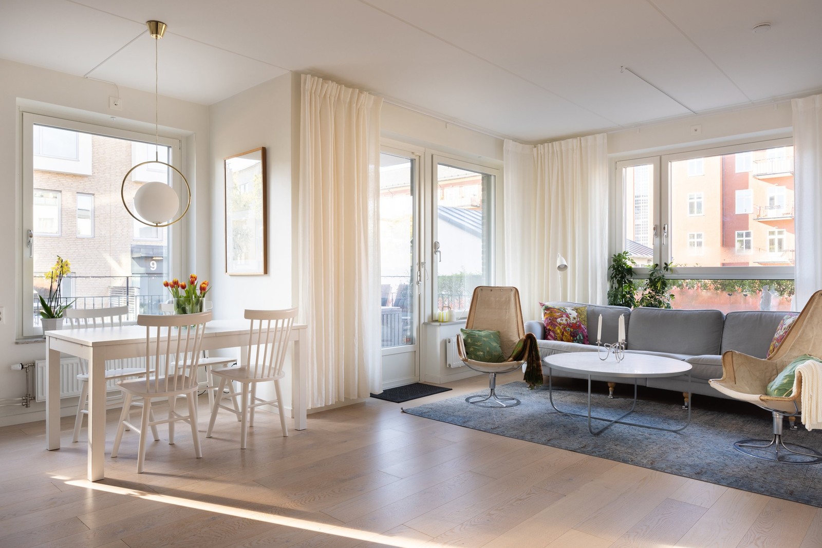 Vardagsrummet ligger i öppen planlösning mot kök. Här finns stora fönster med lummig utsikt, samt utgång mot bostadens större uteplats. Detta kombinerat med rummets väl tilltagna takhöjd ger en härlig rymd. Här finns plats förr soffgrupp, soffbord samt tv-möbel.