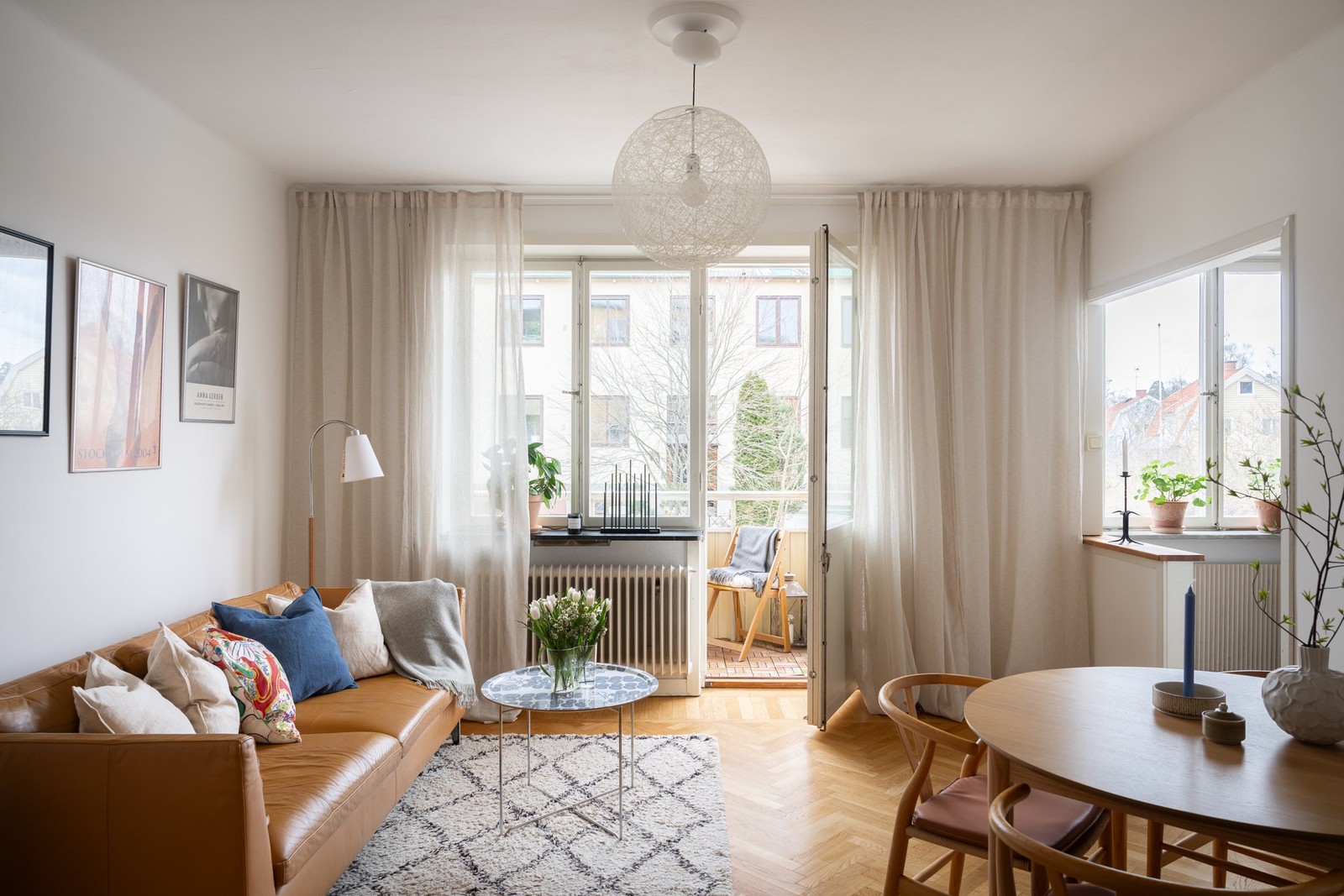 Trivsamt och ljust vardagsrum med vitmålade väggar och bevarad fiskbensmönstrad stavparkett i ek. Rummet erbjuder gott om plats för både soffgrupp, matplats och arbetsyta vid behov. Det generösa ljusinsläppet från fönstret förstärks av balkongdörrens glasparti, och via vardagsrummet når du bostadens balkong som blir en naturlig förlängning av rummet under sommarhalvåret.