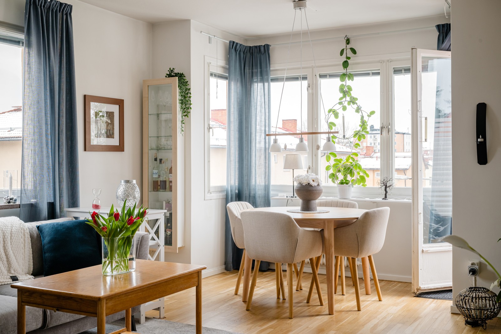 Bostaden präglas av bevarade detaljer som tidstypiska spanjoletter i fönstren och vackra fönsterbrädor – charmiga inslag som ger hemmet själ och personlighet.