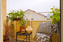Solig balkong i söderläge med plats för sittgrupp och växter som trivs i solen. Högt, fritt läge och härlig utsikt söderut.