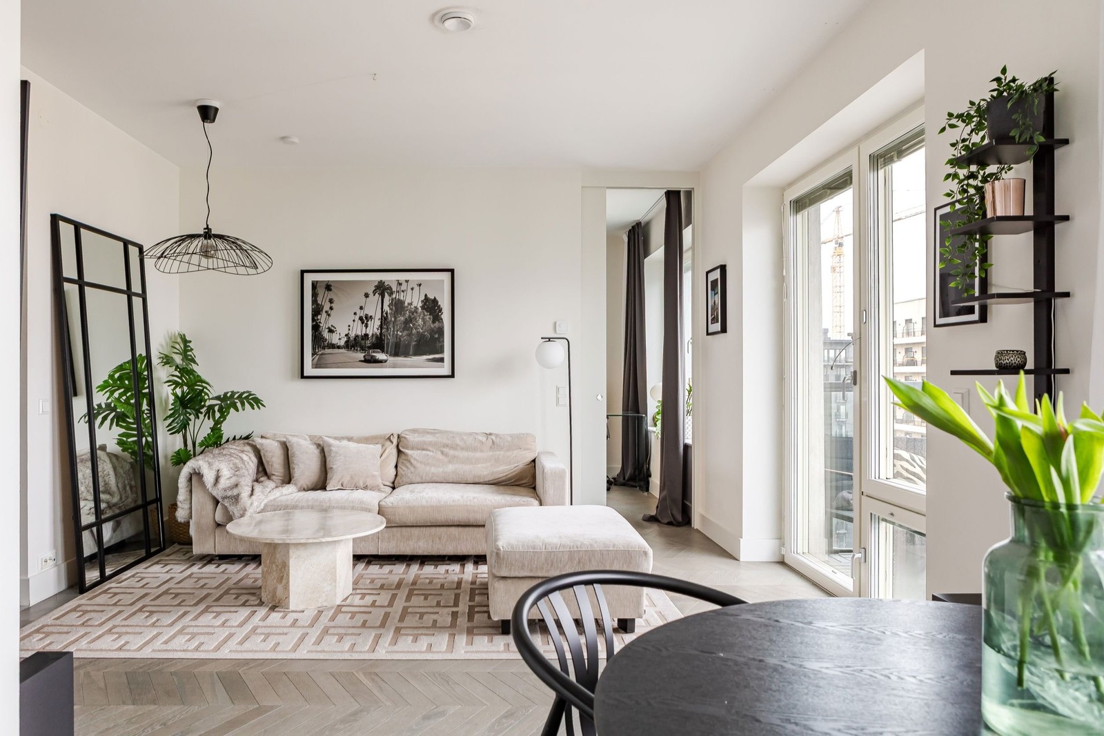 Den öppna planlösningen skapar en luftig och sammanhängande yta där ljuset strömmar in genom de stora fönsterpartierna. Här finns plats för både generösa sällskapsmöbler och kompletterande inredning. Väggarna i mjuk vit ton ger rummet en harmonisk känsla och fungerar som en perfekt bas för olika inredningsstilar. Från vardagsrummet nås också bostadens balkong.