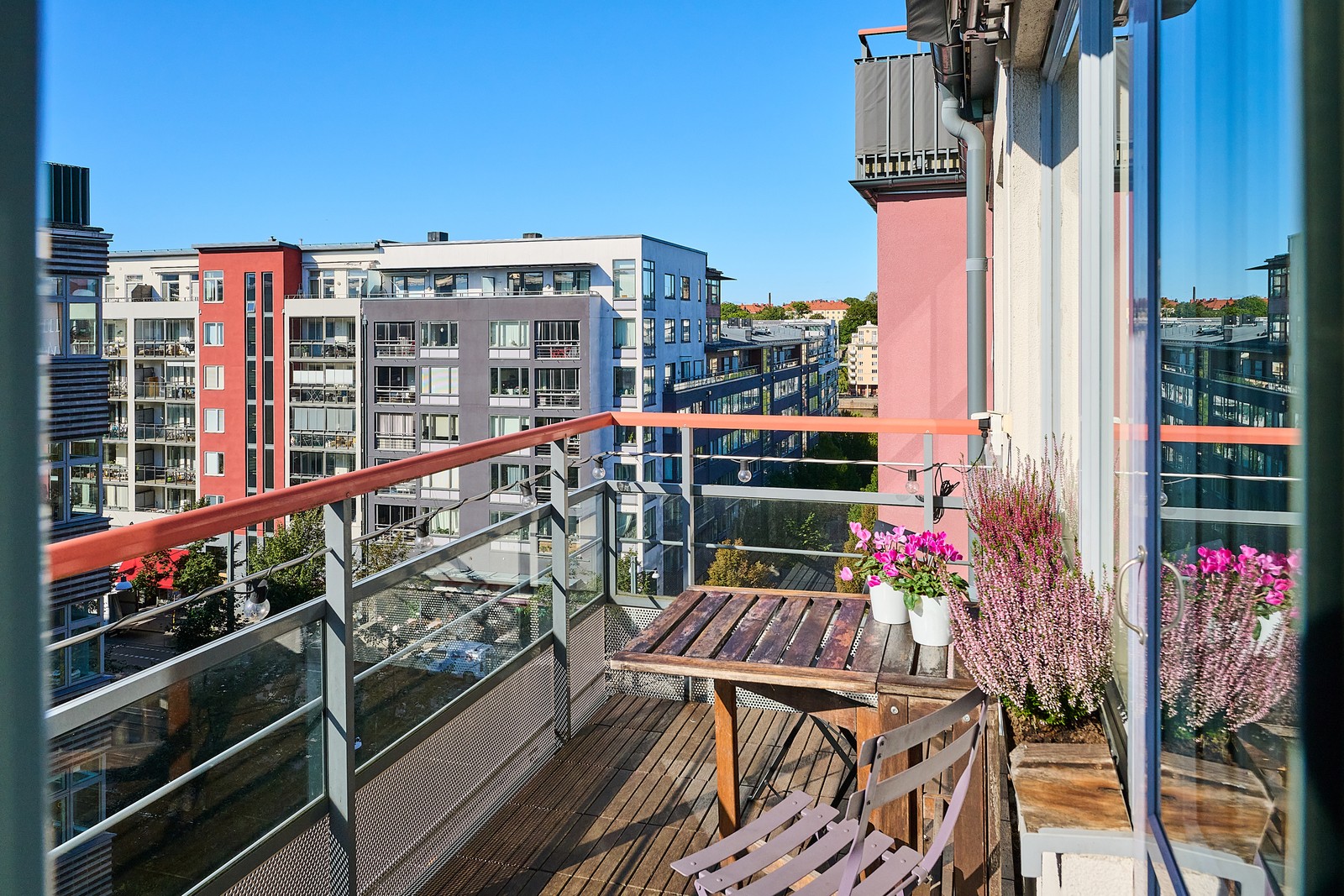 Ljus trea högt upp i huset med balkong – i hjärtat av Hammarby Sjöstad!