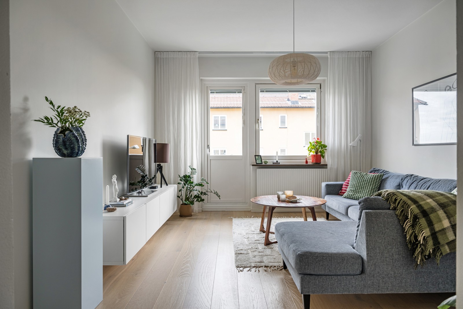 Trivsamt vardagsrum med utgång till bostadens balkong. Rummet kan möbleras med bl.a. soffa, soffbord, TV-möbel och bokhylla. Balkongen ligger i ett högt och fritt läge och med väldigt trevlig utsikt, här kan man njuta av solen hela dagen.